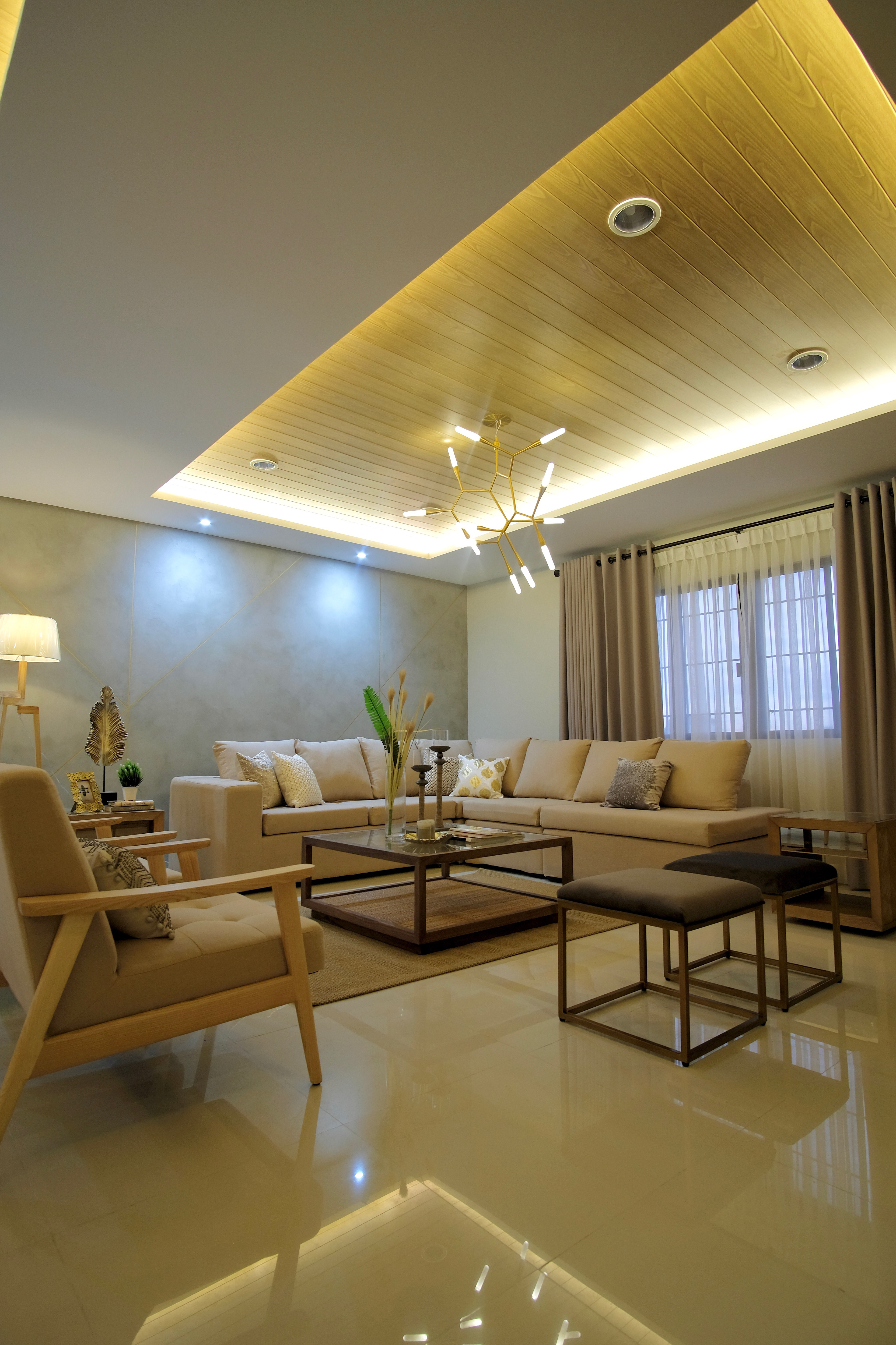 The living room has several points of interest. It is dominated by decorative concrete walls with a geometrical design in Gold lining that flows through the foyer made by Grayscale. Connection and balance are established between the White tiled floor and wooden accent in the ceiling. Aside from that, it makes the room brighter and bigger. An elegant and modern chandelier from Lucendi drapes from the ceiling. To maximize the open layout and clean design of the living area, neutral colors are handpicked for the furniture and finishes from Philux. The family is enthusiastic in having guests, they wanted a spacious layout for their living area. The sofa is custom made to be big, the purpose of that is to have more space for interaction, activities, and leisure. The contrast shows in different textures of metal, wood, fabric, glass, and plants from Tierra Plants. Floor lamp from Lumina Concepts makes for a great piece and source of light that shouldn’t be missed out. The living area is simple and classy as it could be.